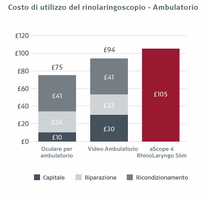 Al St. George's University Hospital, l'analisi comparativa dei costi ha rilevato che aScope 4 RhinoLaryngo riduce i costi nell'Unità di valutazione chirurgica acuta di 73 sterline rispetto ai video rinolaringoscopi riutilizzabili e ha lo stesso costo dei rinolaringoscopi oculari.