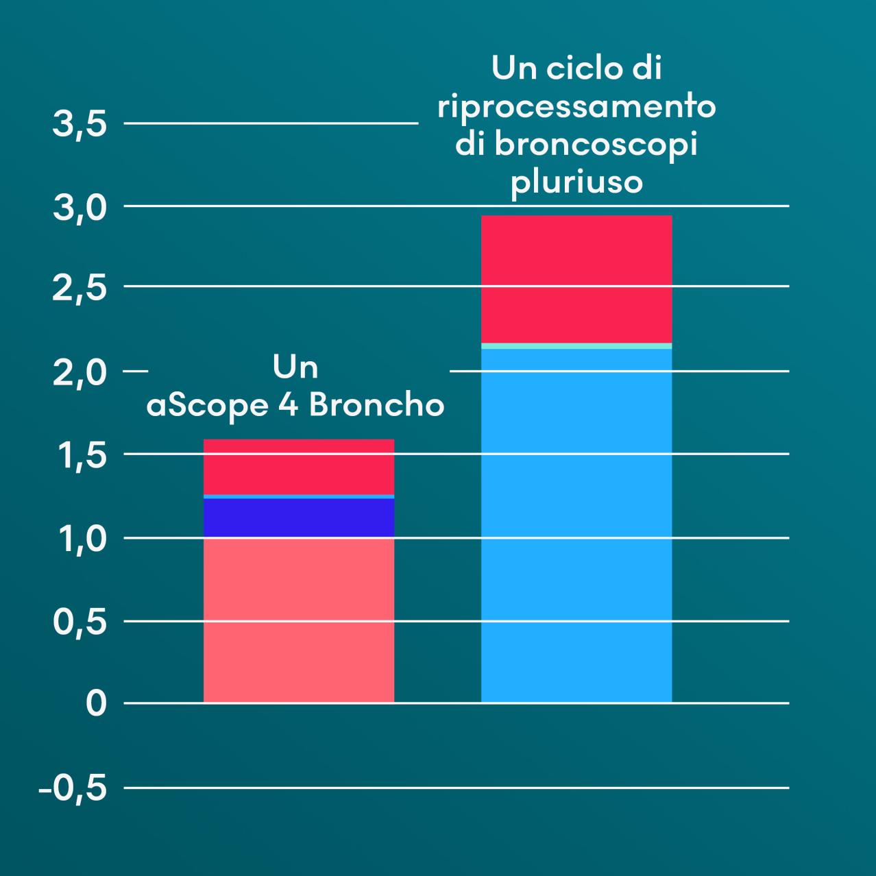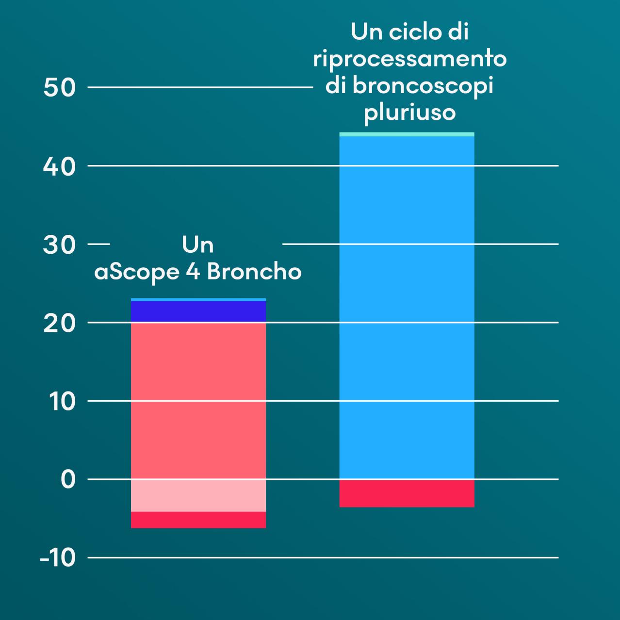 Il monouso elimina un lungo elenco di materiali impiegati come prodotti chimici, acqua, contenitori e dispositivi di protezione individuale. Come mostra il grafico seguente, l'impatto ambientale della broncoscopia monouso è infatti uguale o inferiore a quello della broncoscopia pluriuso.